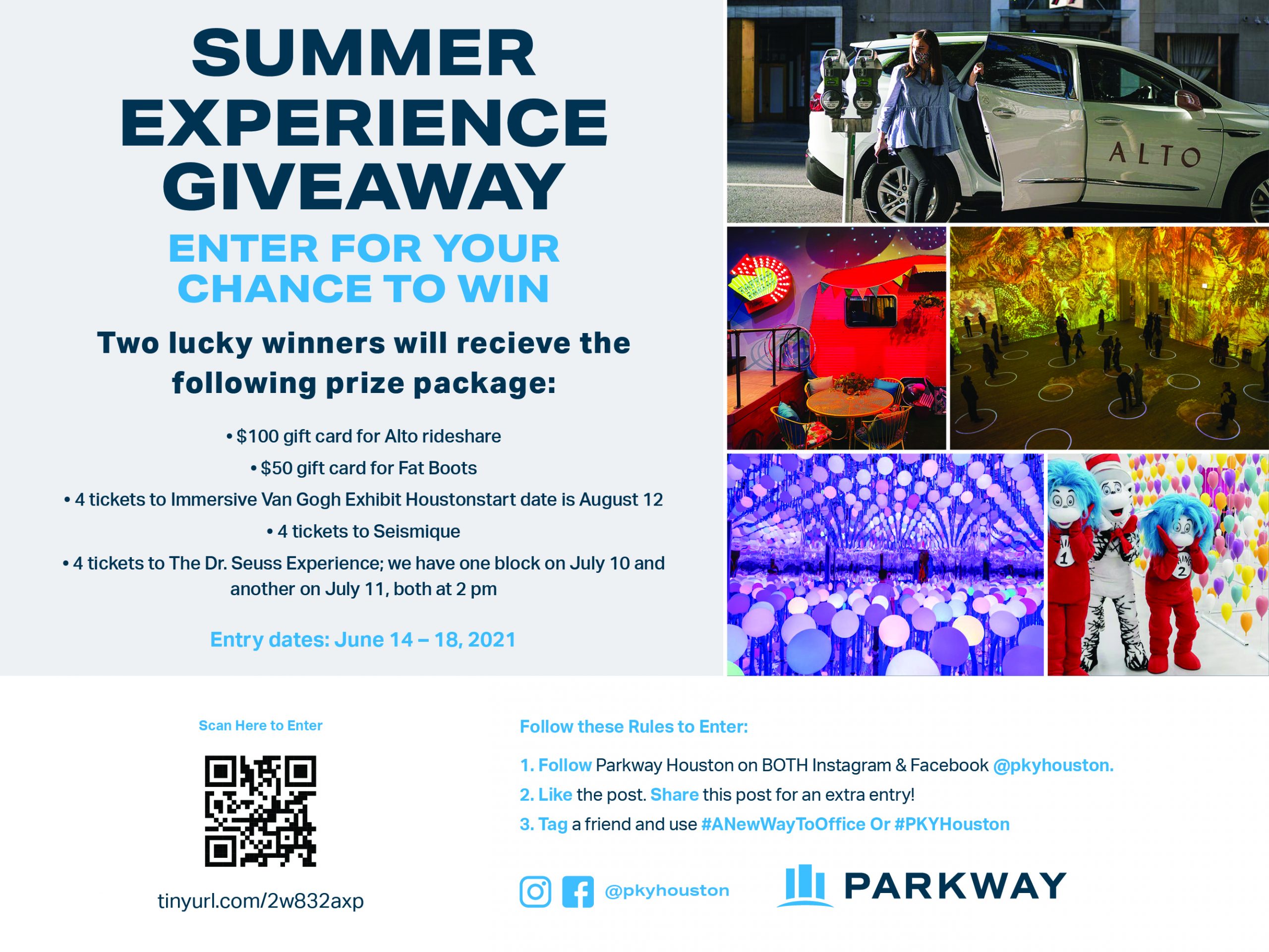 Discover the extraordinary this summer with an experiential prize package spanning the season and with elements geared to adults, children and kids of all ages. Explore three, one-of-a-kind environments with four tickets to each. June brings you to mind-bending creative space Seismique in west Houston. In July, Parkway takes you to The Dr. Seuss Experience steps from downtown’s Discovery Green. In August, be among the first in Houston to enjoy a special preview of blockbuster art happening Immersive Van Gogh Exhibit. Cool off and let the games begin with $50 in credit at one of Houston’s hottest new immersive bars: Fat Boots on Washington Ave. And get to all your destinations safely and luxuriously with $100 in travel for new rideshare service Alto, dedicated to 5 star experiences and vehicles.