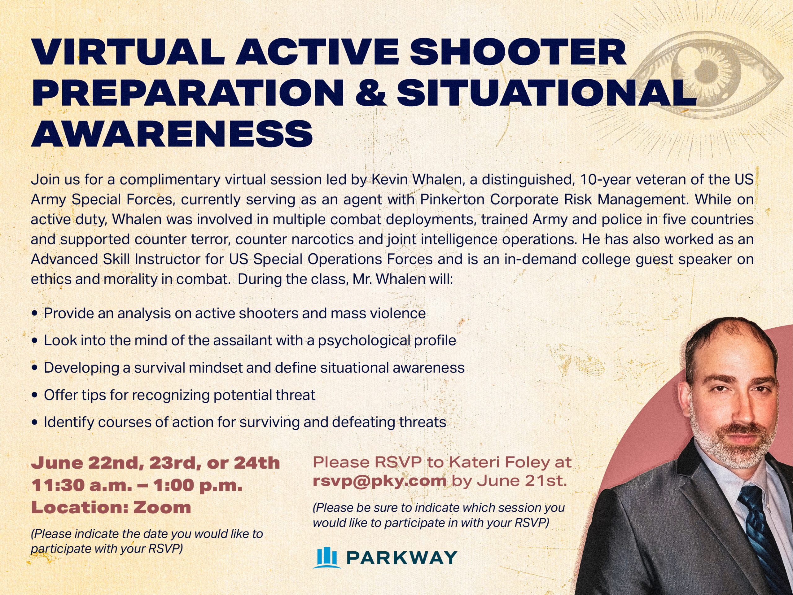 Join us for a complimentary virtual session led by Kevin Whalen, a distinguished, 10-year veteran of the US Army Special Forces, currently serving as an agent with Pinkerton Corporate Risk Management. While on active duty, Whalen was involved in multiple combat deployments, trained Army and police in five countries and supported counter terror, counter narcotics and joint intelligence operations. He has also worked as an Advanced Skill Instructor for US Special Operations Forces and is an in-demand college guest speaker on ethics and morality in combat.